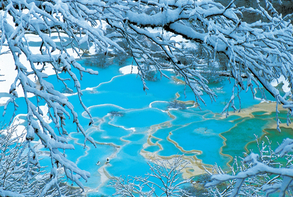 Located in the northwest of Sichuan province, Huanglong Scenic Resort is famed for its colorful lakes, snow-clad mountains, valleys and virgin forests. The well-known attraction features more than 3,000 colorful ponds, sizes of which vary from a few to thousands of square meters. The water in these ponds is azure blue, pure and clear, ranging from inky to shimmering. In winter, the beautiful ponds are blanketed with a white, thin veil, resembling an even purer and more charming wonderland. [Photo by courtesy of Huanglong Natural Resort Tourist Administration]