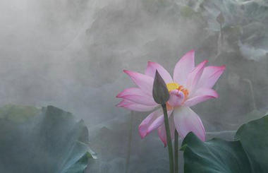 Lotus flowers amid morning mist