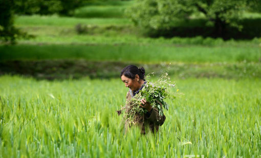 Tibetan farmers in highland barley field