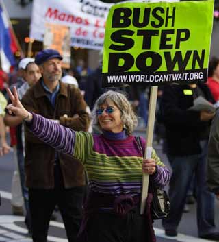 Anti-war demonstrators protest on the third anniversary of the invasion of Iraq in San Francisco, California, March 18, 2006. Anti-war protesters marched through cities across the world on Sunday, three years after the invasion of Iraq, calling for U.S. and British troops to pull out. [REUTERS]