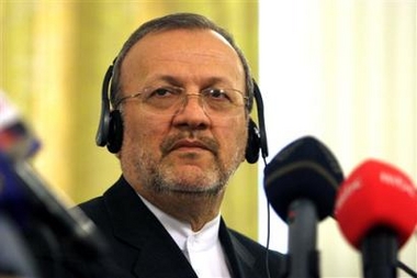 Minister, Manouchehr Mottaki, listens to a question during a joint press