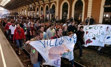 rails at a train station in the southwest city of Toulouse, and four protesters