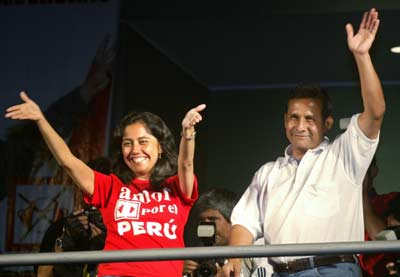 candidate Ollanta Humala (R), accompanied by his wife Nadine Heredia,