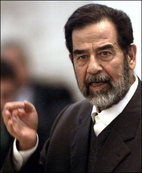 Saddam Hussien testifies during cross-examination at an earlier session of