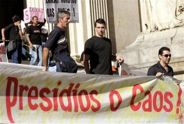 and prison guards protest as they hold a banner that reads 'Prisons, the