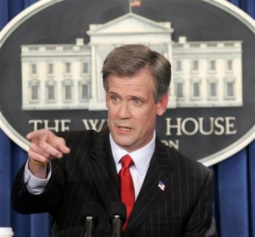 Tony Snow conducts his first press briefing in the Brady Press Briefing