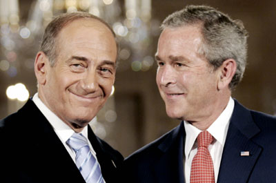 W. Bush (R) and Israeli Prime Minister Ehud Olmert smile after speaking to