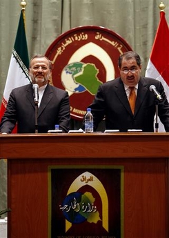 Iraq Foreign Minister Hoshiyar Zebari (R) and his Iranian counterpart Manouchehr Mottaki hold a joint news conference in Baghdad, May 26, 2006. [Reuters]