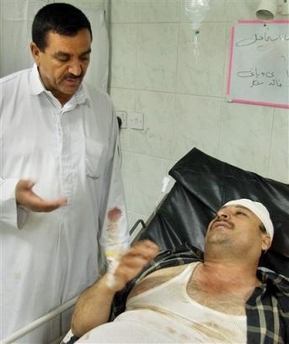 Haqi Ismail, one of the survivors of the attack, lies injured at a hospital in Sulaimaniyah, accompanied by his brother-in-law, left, after gunmen killed 21 people, including 3 high-school students and 9 college students, and wounded Ismail, after they dragged them off buses inbetween Qara Tappah and Baqouba, in Iraq Sunday, June 4, 2006. The gunmen spared four Sunni Arabs, in one of the worst sectarian atrocities in recent weeks and Ismail only survived because the gunmen thought he was dead. [AP]