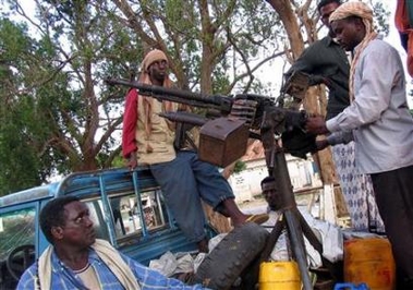 Members of a Somali Islamic Court militia examine captured weapons in Bal'ad area after clashes with a self-styled anti-terrorism coalition of warlords June 4, 2006. [Reuters]
