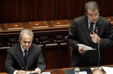Prodi, right, flanked by Defense Minister Arturo Parisi delivers his