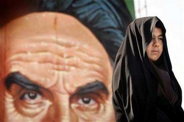 A woman attends a religious ceremony to commemorate the anniversary of the death of Iran's Late Leader Ayatollah Ruhollah Khomeini, while standing under a huge portrait of Khomeini in Tehran, June 4, 2006. [Reuters]