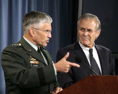 Casey (L) speaks as U.S. Secretary of Defense Donald Rumsfeld watches
