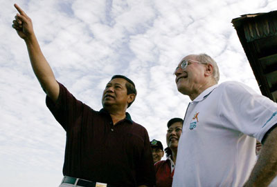 Susilo Bambang Yudhoyono (L) during Howard's morning jog in Nongsa point beach