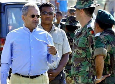 Ramos-Horta (L) talks to a Portuguese soldier in Dili. Ramos-Horta has