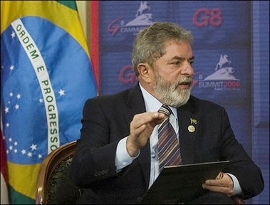 Luiz Inacio Lula da Silva speaks with his US counterpart George W. Bush