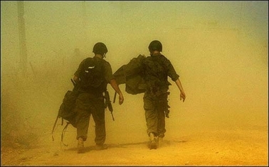 Israeli soldiers walk out, away from the Lebanese border on their way to