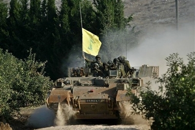 an armored personnel carrier, hold a Hezbollah flag as they cross the