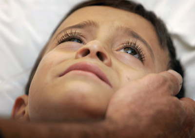 Israeli air strike, lies on a bed at a hospital in the village of Riya,