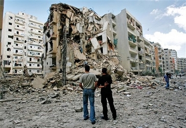 Shiite men look at destroyed apartment buildings in the Hezbollah