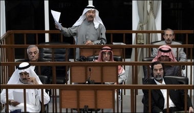 addressing the court during Saddam Hussein's genocide trial in Baghdad.