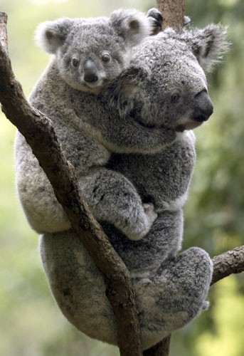 Koala Sabrina and her 10-month-old joey Sapphire, produced by artificial insemination, are seen at Currumbin Wildlife Sanctuary in Gold Coast October 30, 2006. Australian scientists unveiled three test-tube koala joeys on Monday as part of an artificial insemination programme to preserve the vulnerable mammal. [Reuters]