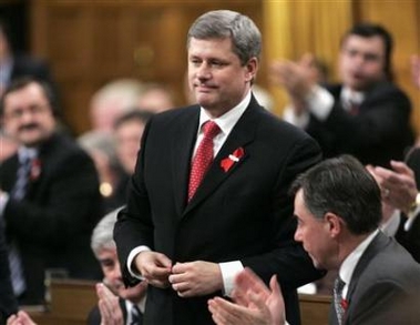 Canada's Prime Minister Stephen Harper (C) stands to vote in the House of Commons on Parliament Hill in Ottawa November 27, 2006. [Reuters]