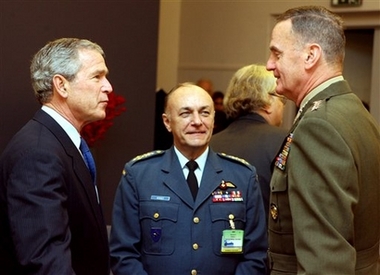 US President George W. Bush, left, shares a word with Supreme Allied Commander Europe, US General James L. Jones, right, and Chairman of the NATO Military Committee Canadian General Raymond Henault, center, during a dinner prior to a NATO summit in Riga, Tuesday Nov. 28, 2006. [AP]