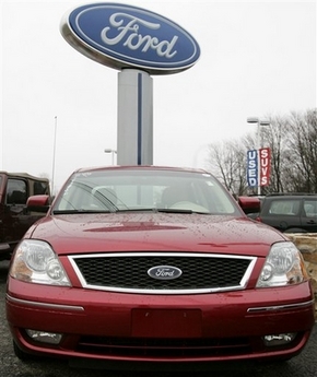 A Ford sedan sits in front of a sign bearing the car company's logo in a parking lot at a Ford dealership, in Norwood, Mass., Wednesday, Nov. 29, 2006. [AP]