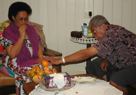 Fiji's Prime Minister Laisenia Qarase (R) eats breakfast with his wife at his Suva residence December 5, 2006. Qarase said he was under house arrest on Tuesday after heavily armed troops surrounded his residence in the capital Suva, and accused the military of staging a coup. [Reuters]