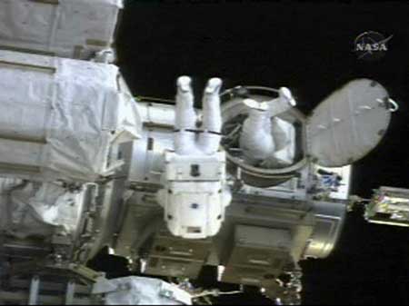 In this image from NASA TV astronauts Sunita Williams (R) and Robert Curbeam (L) as they exit the International Space Station's Qwest airlock at the beginning of their spacewalk December 16, 2006. [Reuters]