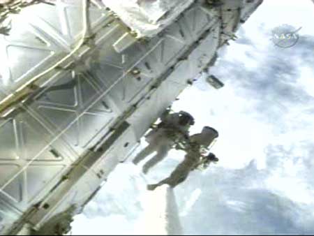 In this image from NASA TV astronaut Sunita Williams works outside the International Space Station installing a foot restraint on the station's robotic arm December 16, 2006. [Reuters]