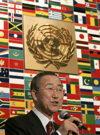 The incoming UN Secretary General Ban Ki-moon speaks in front of the monument to celebrate his inauguration to being UN Secretary General at South Korea's Foreign Ministry office in Seoul December 26, 2006. It is not time to give up hope on international talks aimed at ending North Korea's nuclear weapons programme, Ban Ki-moon said on Tuesday. [Reuters]