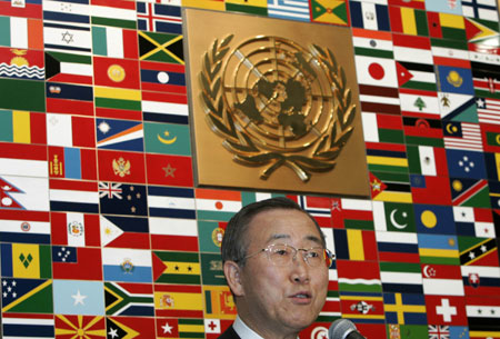 The incoming UN Secretary General Ban Ki-moon speaks in front of the monument to celebrate his inauguration to being UN Secretary General at South Korea's Foreign Ministry office in Seoul December 26, 2006. It is not time to give up hope on international talks aimed at ending North Korea's nuclear weapons programme, Ban Ki-moon said on Tuesday. [Reuters]