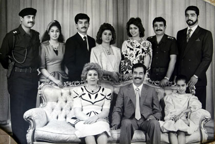 Saddam Hussein's family (clockwise from top L), son-in-law Saddam Kamel and daughter Rana, son Qusay and daughter-in-law Sahar, daughter Ragda and son-in-law Hussein Kamal, son Uday, daughter Hala, Saddam Hussein and his first wife Sajda Kher Ala, pose in this undated photo from the private archive of an official photographer for the regime. U.S.-backed Iraqi television station Al Hurra said Saddam Hussein had been executed by hanging shortly before 6 a.m. (0300 GMT) on December 30, 2006. [Reuters]