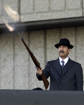 Saddam Hussein fires shots into the air, during what appeared to be the biggest military parade since the 1991 Gulf War, in Baghdad in this December 31, 2000 file photo. U.S.-backed Iraqi television station Al Hurra said Saddam Hussein had been executed by hanging shortly before 6 a.m. (0300 GMT) on December 30, 2006. [Reuters]