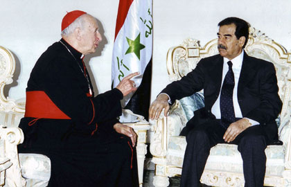 | Cardinal Roger Etchegaray (L) meets Saddam