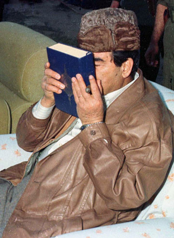 Saddam Hussein holds a cigar while he kisses the Koran in the holy shrine of Sammara, 120 km (75 miles) north of Baghdad in this March 12, 1998 file photo. U.S.-backed Iraqi television station Al Hurra said Saddam Hussein had been executed by hanging shortly before 6 a.m. (0300 GMT) on December 30, 2006. [Reuters]