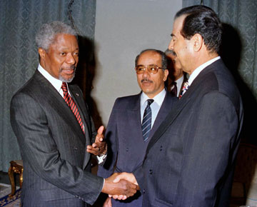 Saddam Hussein (R) shakes hands with U.N. Secretary General Kofi Annan (L) at the start of a meeting to defuse a crisis over access for weapons inspectors to Iraq's eight presidential sites in Baghdad in this February 22, 1998 file photo. U.S.-backed Iraqi television station Al Hurra said Saddam Hussein had been executed by hanging shortly before 6 a.m. (0300 GMT) on December 30, 2006. [Reuters]