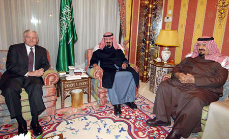 Saudi King Abdullah (C) and Crown Prince Sultan (R) meet with US