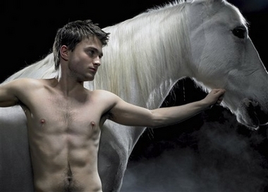 Radcliffe, 17, dares to bare it all alongside a white horse; in another, he is
