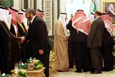 US and Israeli acceptance is crucial to the deal's success. Unless they are convinced Hamas has sufficiently moderated, the West is unlikely to lift a crippling financial blockade of the Palestinian government, and it will be difficult to advance the peace process. "Israel expects a new Palestinian government to respect and accept all three of the international community principles - recognition of Israel, acceptance of all former agreements and renunciation of all terror and violence," Israeli government spokeswoman Miri Eisin told The Associated Press after the accord was announced. She would not say whether Israel believes the guidelines of the new government fulfill those demands. In Washington, State Department deputy spokesman Tom Casey said "we'll see what any final agreement actually looks like and we'll have to make an evaluation from there" as to whether it meets international demands. Palestinians hope the agreement will avert an outright civil war. Hamas and Fatah gunmen have clashed repeatedly in recent months, killing dozens - including 30 who died in four days of fighting that ended with a fragile truce Sunday. The deal could also fall apart as the two sides work out who will fill sensitive posts in the new government - particularly the interior ministry, which controls security forces. Saudi Arabia - which put its credibility on the line by hosting the high-profile summit in the holy city of Mecca - will likely now face the task of selling the agreement to its ally, the United States. To boost the new government, the kingdom promised $1 billion in aid to the Palestinians, according to Ahmed Youssef, a political adviser to Prime Minister Ismail Haniyeh of Hamas, speaking in Gaza. Palestinian President Mahmoud Abbas, of Fatah, and Hamas leader Khaled Mashaal headed two days of intense negotiations in a Mecca palace overlooking the Kaaba, Islam's holiest shrine - a venue Saudi Arabia chose to step up the pressure on the two sides to compromise. Much of the negotiations centered on a single word. Abbas pressed Hamas to accept the stronger stance of "committing to" past peace accords with Israel signed by the Fatah-dominated Palestinian Liberation Organization. But in the end, he was forced to settle for the promise to "respect" them. The final agreement was announced at a ceremony aired live on Arab television Thursday night, in which Saudi King Abdullah sat with Abbas on his right and Hamas leader Khaled Mashaal on his left. Abbas aide Nabil Amr read a letter from Abbas proclaiming the accord and asking Haniyeh of Hamas to form the new coalition government within five weeks, divvying up Cabinet posts between the factions according to a formula agreed on in the Mecca talks. Abbas and Mashaal insisted the agreement would bring peace between their factions and lavished praise on the Saudi monarch for his help - even comparing him to the Prophet Muhammad in his ability to bring reconciliation. The Palestinian president said the deal would "satisfy our people ... and bring us to the shores of peace ... This initiative has been crowned with success." Mashaal vowed the accord would put an end to violence after a series of truces between Fatah and Hamas gunmen that collapsed. "I tell those who fear that the fate of this agreement will be the same fate of the old ones, ... we have pledged our allegiance to God from this sacred place .... and we will go back to our country fully committed to it." "I say to our young people that this is an agreement of the leadership of the