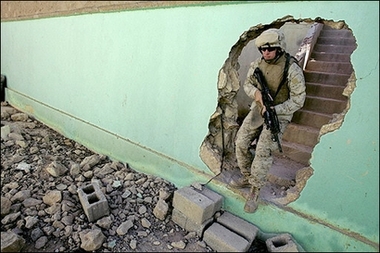 A US marine secures a position in the Iraqi-Syrian border town of Kusaiybah, in western Iraq, in 2005. The United States will attend a ministerial level meeting of Iraq's neighbors, including Iran and Syria, as well as other world powers to discuss Iraq's future, US Secretary of State Condoleezza Rice indicated Tuesday. [AFP]