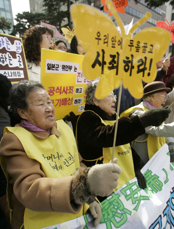 Former South Korean comfort women, who were forced to become sex slaves by Japanese soldiers during World War II, chant anti-Japanese slogans at a protest in front of the Japanese embassy in Seoul March 7, 2007. Japanese Prime Minister Shinzo Abe, seeking to bolster support within his conservative base, has stirred anger in China and South Korea by appearing to question the state's role in forcing women to be sex slaves for its soldiers during World War Two. The yellow sign reads 'Apologize to us on your knees'.[Reuters]