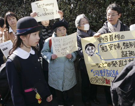 A schoolgirl walks past demonstrators holding banners at a rally protesting Japanese Prime Minister Shinzo Abe's remarks on "comfort woman" - Japan's euphemism for wartime sex slaves - near the parliament in Tokyo March 7, 2007. The protestors are holding banners calling on Japan to acknowledge that comfort women were coerced into serving in Japanese military brothels. Abe stirred anger in China and South Korea with remarks last week appearing to question the state's role in forcing the mostly Asian women to act as prostitutes during World War Two, although he also said the earlier apology stood. The Korean placard reads, "Prime Minister, have you ever met the victims?" [Reuters]