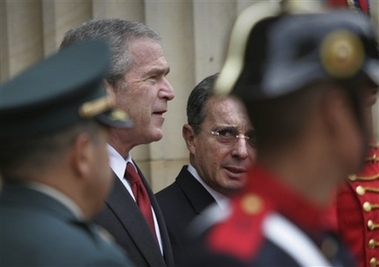 US President George W. Bush, left, stands with Colombia's President Alvaro Uribe during an arrival ceremony in Bogota, Sunday, March 11, 2007. (AP US President George W. Bush, left, stands with Colombia's President Alvaro Uribe during an arrival ceremony in Bogota, Sunday, March 11, 2007. [AP]