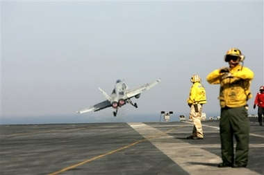 While they would not say when the war games were planned, US commanders insisted the exercises were not a direct response to Friday's seizure of the 15 British sailors and marines, but they also made clear that the flexing of the Navy's military might was intended as a warning. "If there is strong presence, then it sends a clear message that you better be careful about trying to intimidate others," said Capt. Bradley Johanson, commander of the Stennis. "Iran has adopted a very escalatory posture with the things that they have done," he added. The exercises began four days after Iranian forces detained the 15 Britons for allegedly being in Iranian territorial waters near the northern end of the Gulf. US and British officials insist the team was properly searching cargo vessels inside Iraqi waters. F/A-18 fighter jets roared off the Stennis' flight deck all day, mounting a dozen rapid-fire training sorties against imaginary enemy ships and aircraft. A second task force with the carrier USS Dwight D. Eisenhower also took part in the drills. "These maneuvers demonstrate our flexibility and capability to respond to threats to maritime security," said Navy Lt. John Perkins, 32, of Louisville, Ky., as the Stennis cruised about 80 miles off the United Arab Emirates after entering the Persian Gulf overnight. "They're showing we can keep the maritime environment safe and the vital link to the global economy open." At the headquarters of the Navy's 5th Fleet in Bahrain, Cmdr. Kevin Aandahl said the maneuvers would last several days. He said US warships would stay out of Iran's territorial waters, which extend 12 miles off the Iranian coast. None of America's naval coalition partners in the region joined the maneuvers. A French naval strike group, led by the aircraft carrier Charles de Gaulle, was operating just outside the Gulf in the Arabian Sea. But the French ships were supporting NATO forces in Afghanistan and not taking part in the US maneuvers, Aandahl said. At the Pentagon, spokesman Bryan Whitman said the Navy routinely conducts exercises when its forces are deployed near each other. "The exercise should reassure our friends and allies of our commitment to security and stability in the region," Whitman said. "We are not interested in confrontation in the Gulf." The war games involve more than 10,000 US personnel mounting simulated attacks on enemy aircraft and ships, while hunting submarines and looking for mines. "What it should be seen as by Iran or anyone else is that it's for regional stability and security," Aandahl said. "These ships are just another demonstration of that. If there's a destabilizing effect, it's Iran's behavior." The US drills were the latest in a series of competing American and Iranian
