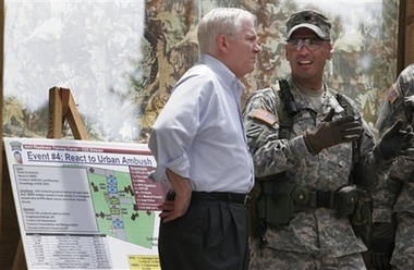 Secretary of Defense Robert Gates left is briefed by Lt. Col. William Boyett as he prepares to observe soldiers of the 3rd Brigade Combat Team 101st Airborne, Golf Company as they train at the Joint Readiness Training Center in Fort Polk, La. Friday, May 4, 2007. [AP]