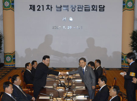 South Korean Unification Minister Lee Jae-joung (R) shakes hands with North Korean chief delegate Kwon Ho-ung at the start of the inter-Korean ministerial talks at a hotel in Seoul May 30, 2007. [Reuters]