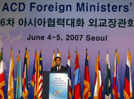 South Korean Prime Minister Han Duck-soo makes a opening statement during an opening ceremony of the 6th Asia Cooperation Dialogue (ACD) Foreign Ministers' meeting at a hotel in Seoul June 5, 2007. [Reuters]